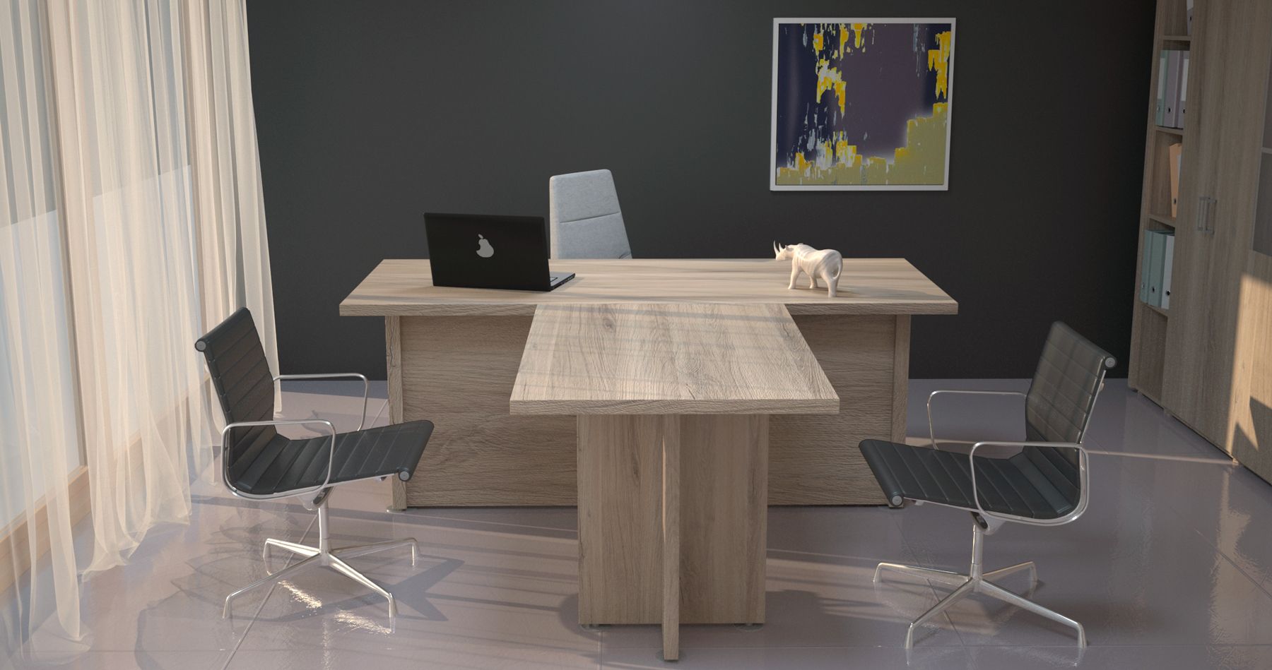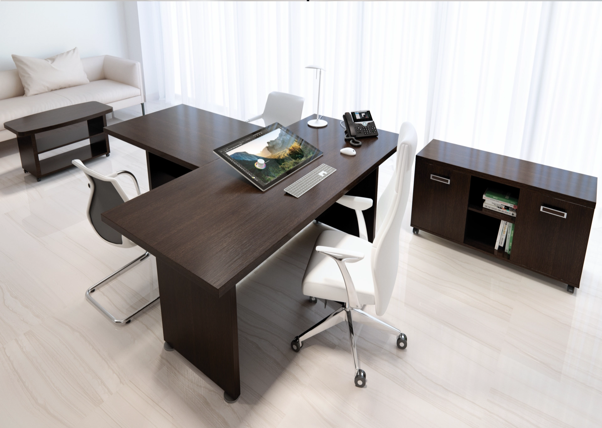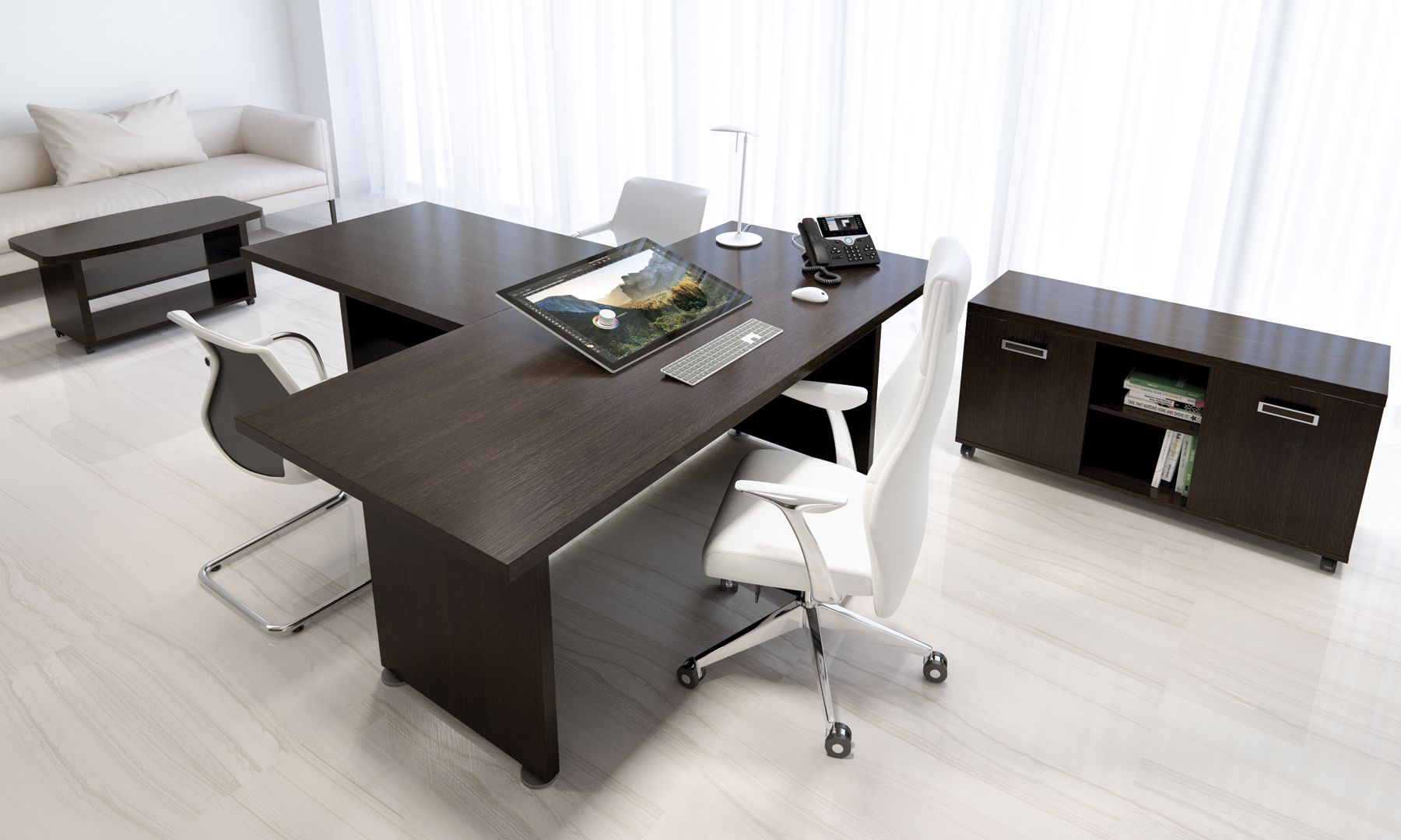 Коллекция мебели Приоритет - это элегантный и привлекательный в манере исполнения кабинет руководителя. Все элементы прекрасно дополняют друг друга, одновременно не ограничивая полет фантазии в их расстановке. Современный дизайн в стиле модерн словно переносит в кабинет руководителя динамичность и основные тенденции современного бизнеса. Мебель привлекательная еще и тем, что для установки не требуется идеальной гладкости поверхности. Причина проста – все опоры у столов и шкафов можно регулировать, тем самым выравнивая рабочую поверхность мебельного гарнитура.