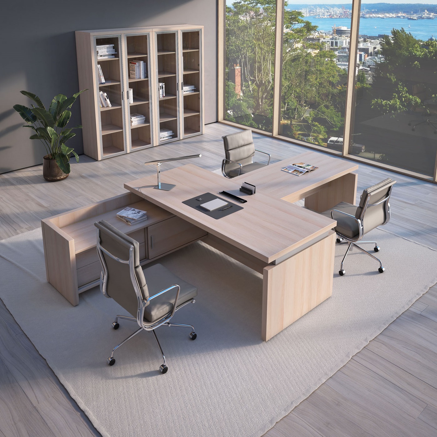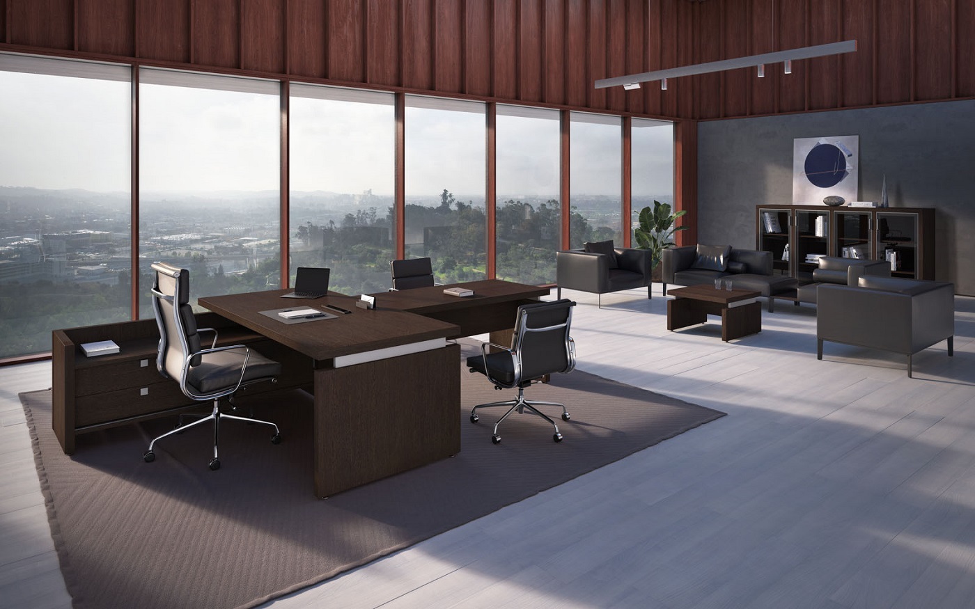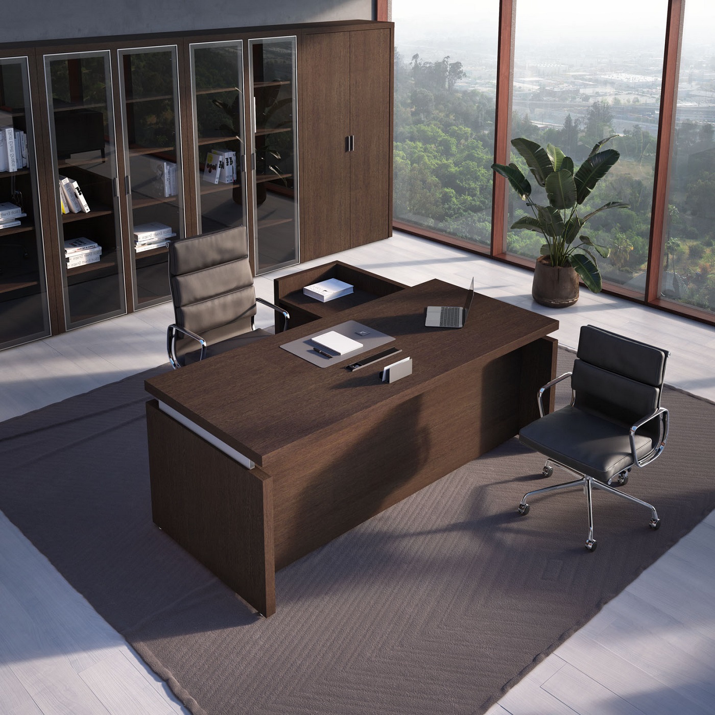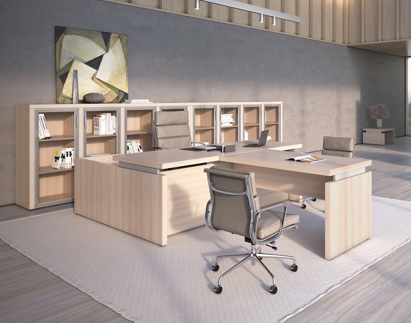 Кабинет руководителя Triumf отличается выразительными геометрическими формами и интеллектуальным дизайном, который визуально разделяет столешницу и каркасы, создавая ощущение легкости и пространства, способствующего творчеству и генерации идей. Гармоничное сочетание простоты линий и благородного контраста материалов подчеркивает, что владелец кабинета способен достигать значительных высот в любой сфере деятельности. Коллекция представлена в двух элегантных цветовых вариантах: благородный Венге ЦАВО, с его теплым оттенком и текстурой натурального дерева, и светлый, легкий Дуб 131, придающий интерьеру воздушность и свет.