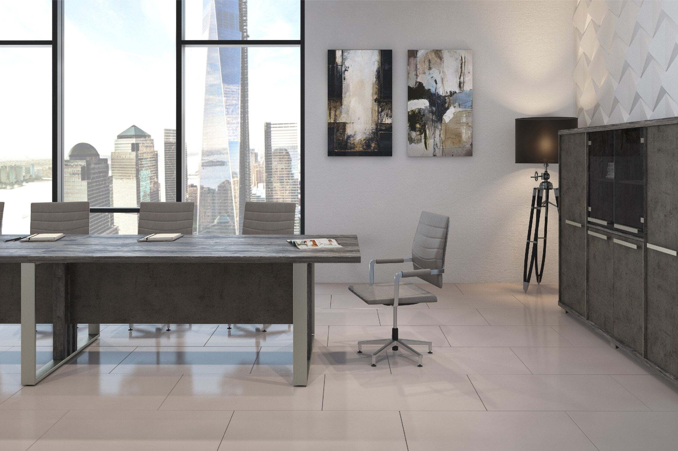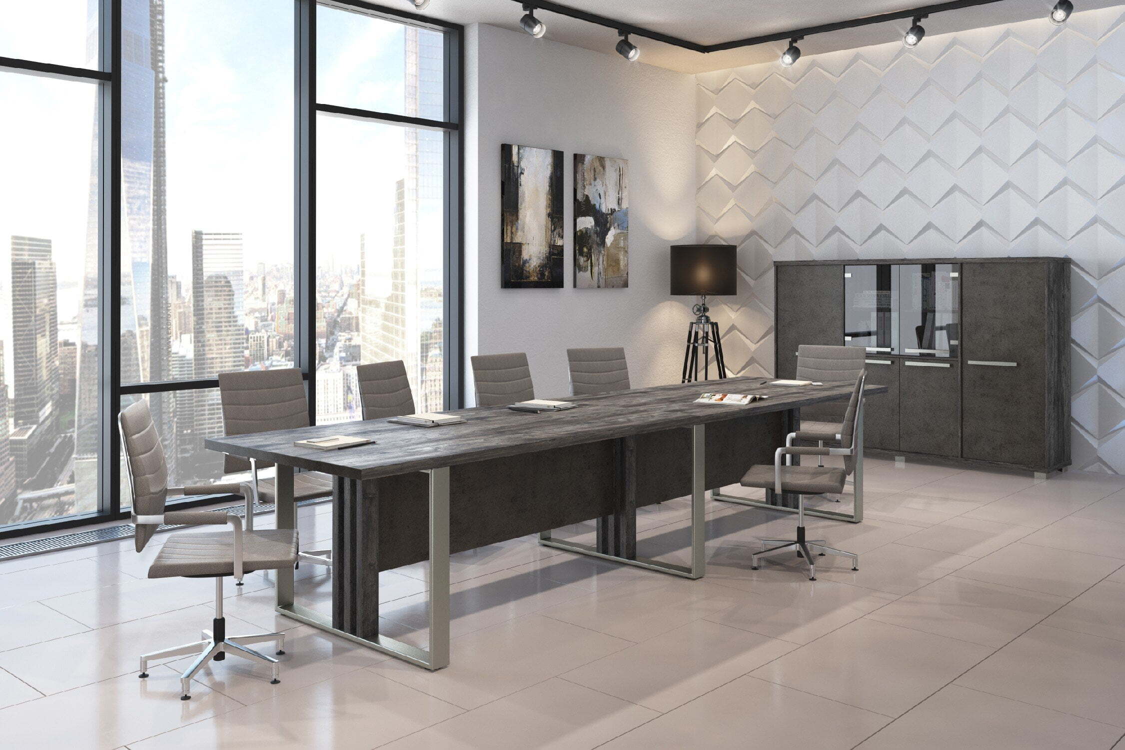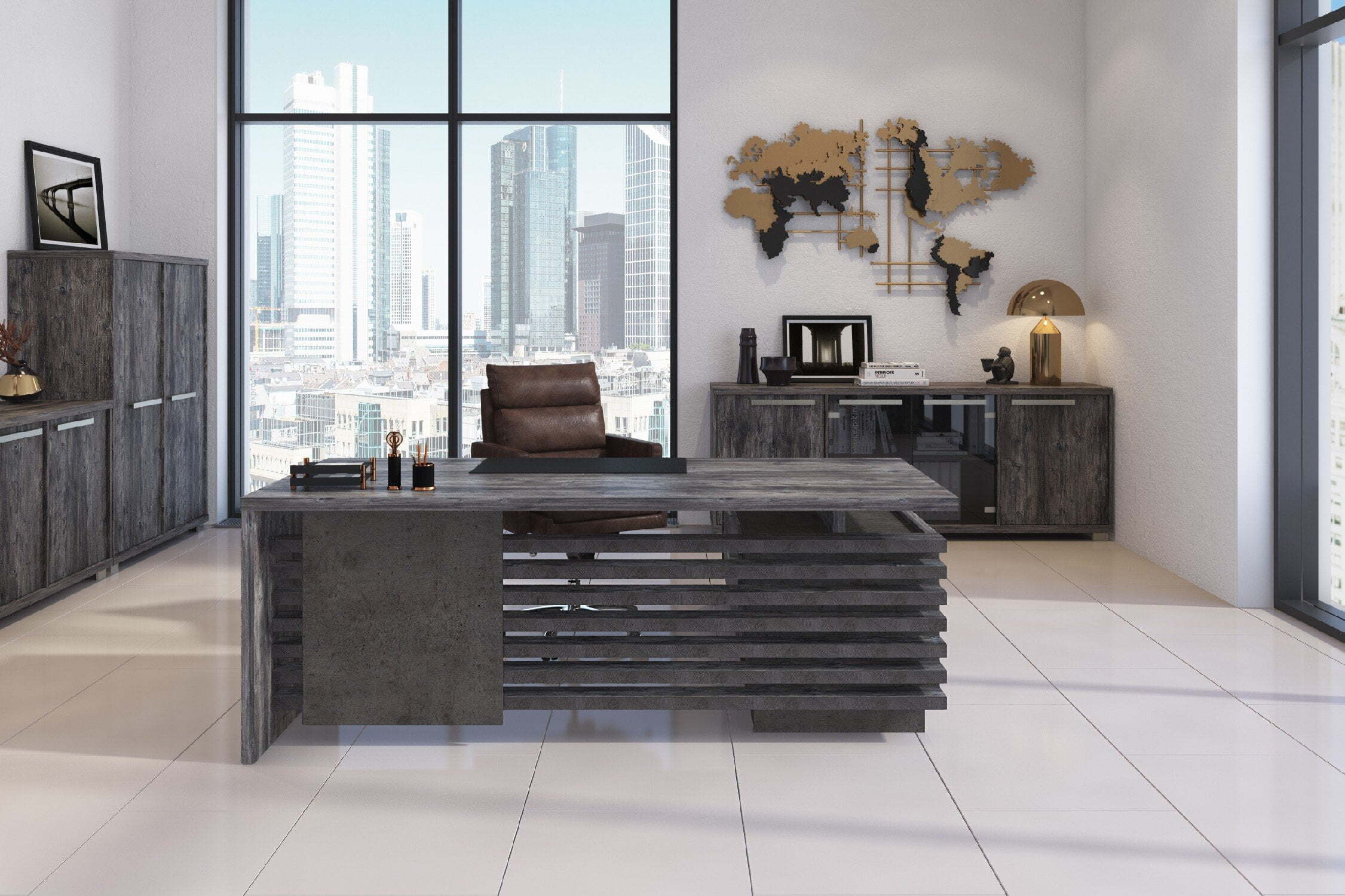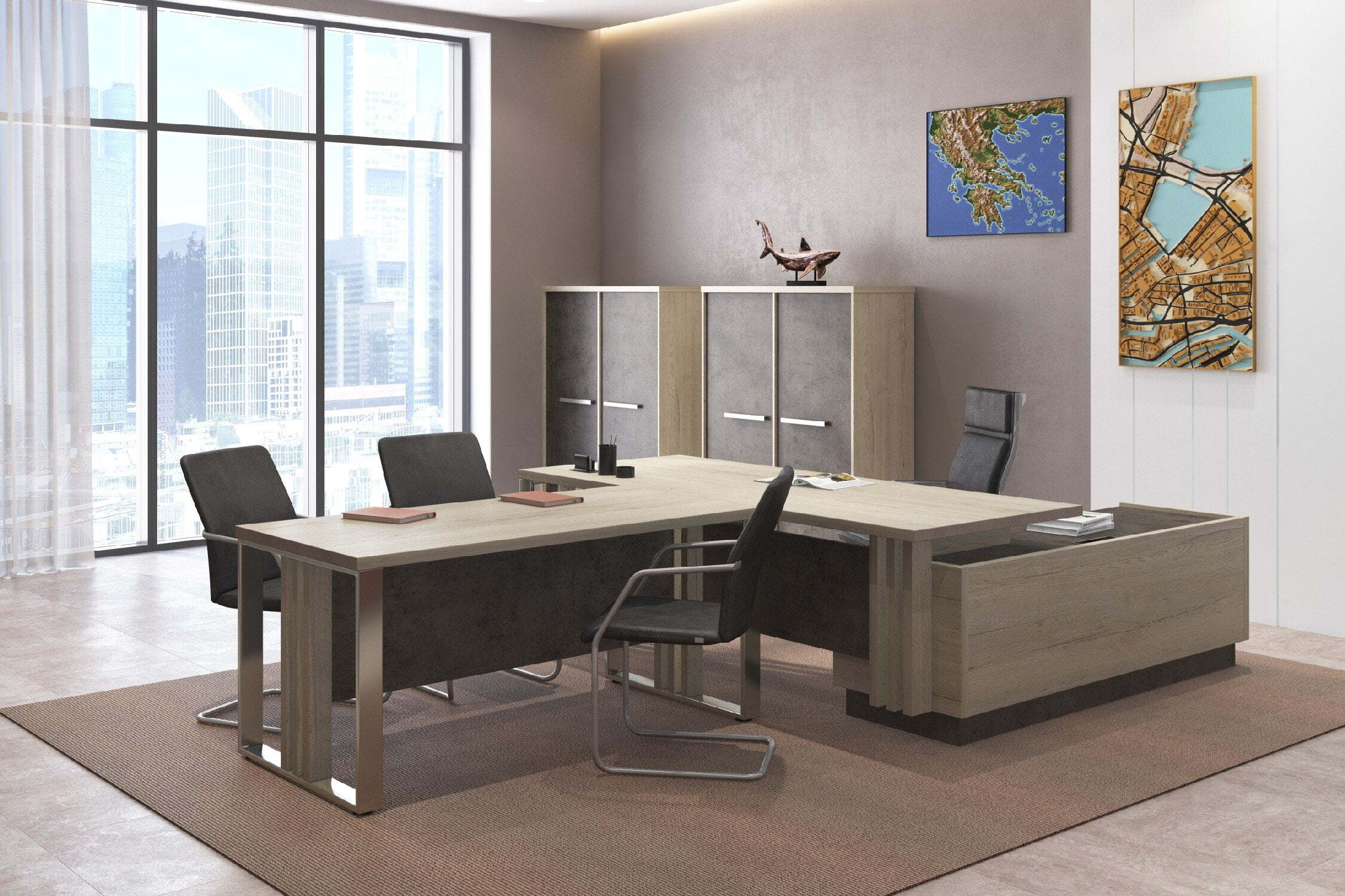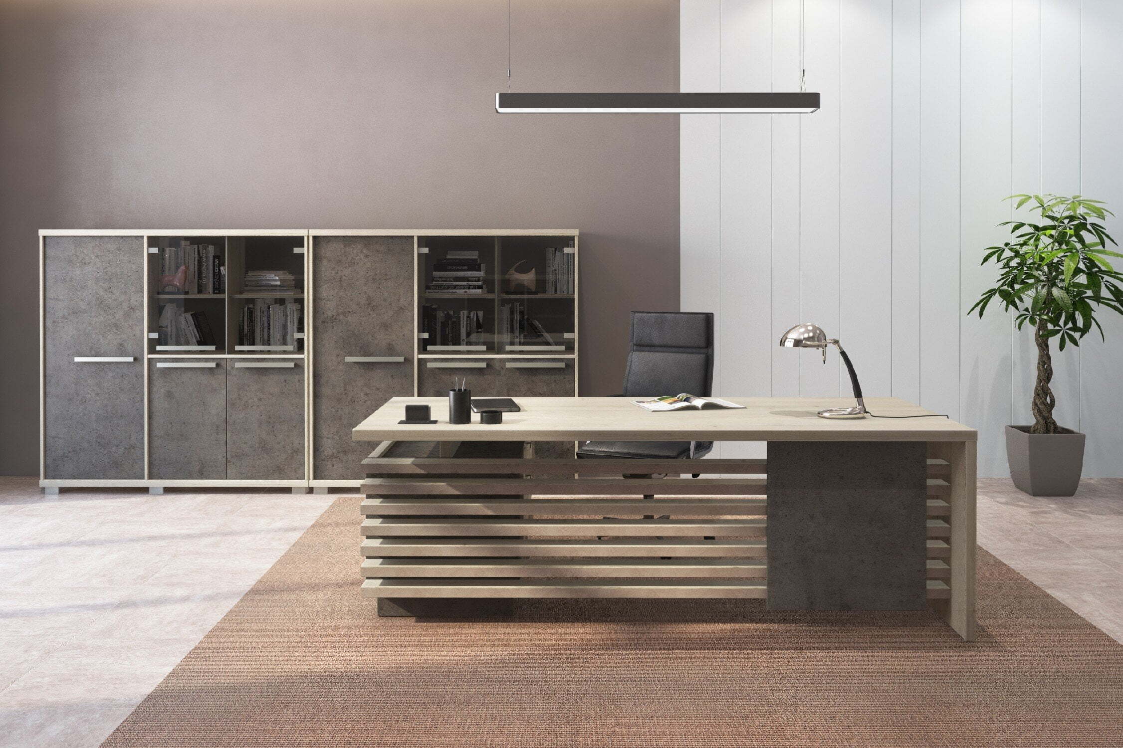 Кабинет для руководителя "Vestar" выделяется необычным дизайнерским решением - сочетание на столешницах кромки с поперечным и продольным рисунком, что даёт визуальный эффект спила натурального дерева. Кабинет "Vestar" - это эталонный выбор современного руководителя.Материал, в котором производится коллекция - ЛДСП. Толщина столешниц - 38мм. Кромка столешниц - ABS 2мм. Коллекция производится в цветах: дуб галифакс/бетон чикаго, сосна пасадена/бетон чекаго.