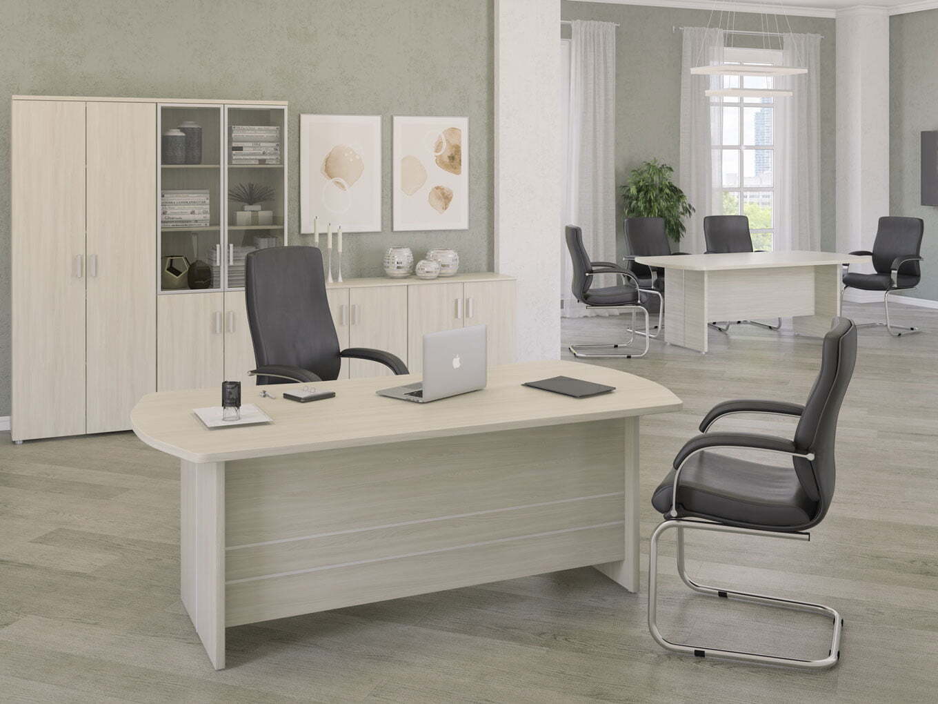 Коллекция мебели для переговоров Bonn – это современный взгляд на классический дизайн, идеально подходящий для создания элегантных и функциональных конференц-залов. Доступная в вариантах отделки ясень и темный дуб, серия предлагает разнообразный набор элементов, включая несколько моделей столов, тумб, шкафа и стеллажей. Этот ассортимент позволяет адаптировать мебель Bonn под любой офис, независимо от его размеров и потребностей. Мебель изготовлена из высококачественного ламинированного ДСП, что гарантирует долговечность и эстетическое наслаждение на долгие годы. Выбирая мебель Bonn, вы создаете пространство, которое способствует продуктивным переговорам и максимальному комфорту участников.