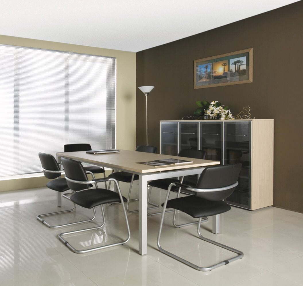 Мебель для переговоров Reventon обладает оригинальными чертами, создающими атмосферу солидности и современного стиля. Столы выделяются асимметричной L-образной опорой и металлическими рамами, что обеспечивает прочность и устойчивость конструкции. Использование ЛДСП "зебрано песочный" в отделке столов придает поверхности приятную текстуру, схожую с натуральным деревом. Опоры-колоны из нержавеющей стали дополняют общий изысканный образ и гарантируют долговечность мебели. Также предусмотрена возможностью объединения стенок из нескольких шкафов под единым топом, позволяя создавать гармоничные композиции и оптимизировать пространство. Вся коллекция производится из высококачественного ЛДСП и имеет ПВХ-кромку толщиной 2 и 0,4 мм. Доступные цветовые решения включают "зебрано песочный" и "венге темный", позволяя выбрать оптимальный вариант для любого интерьера.