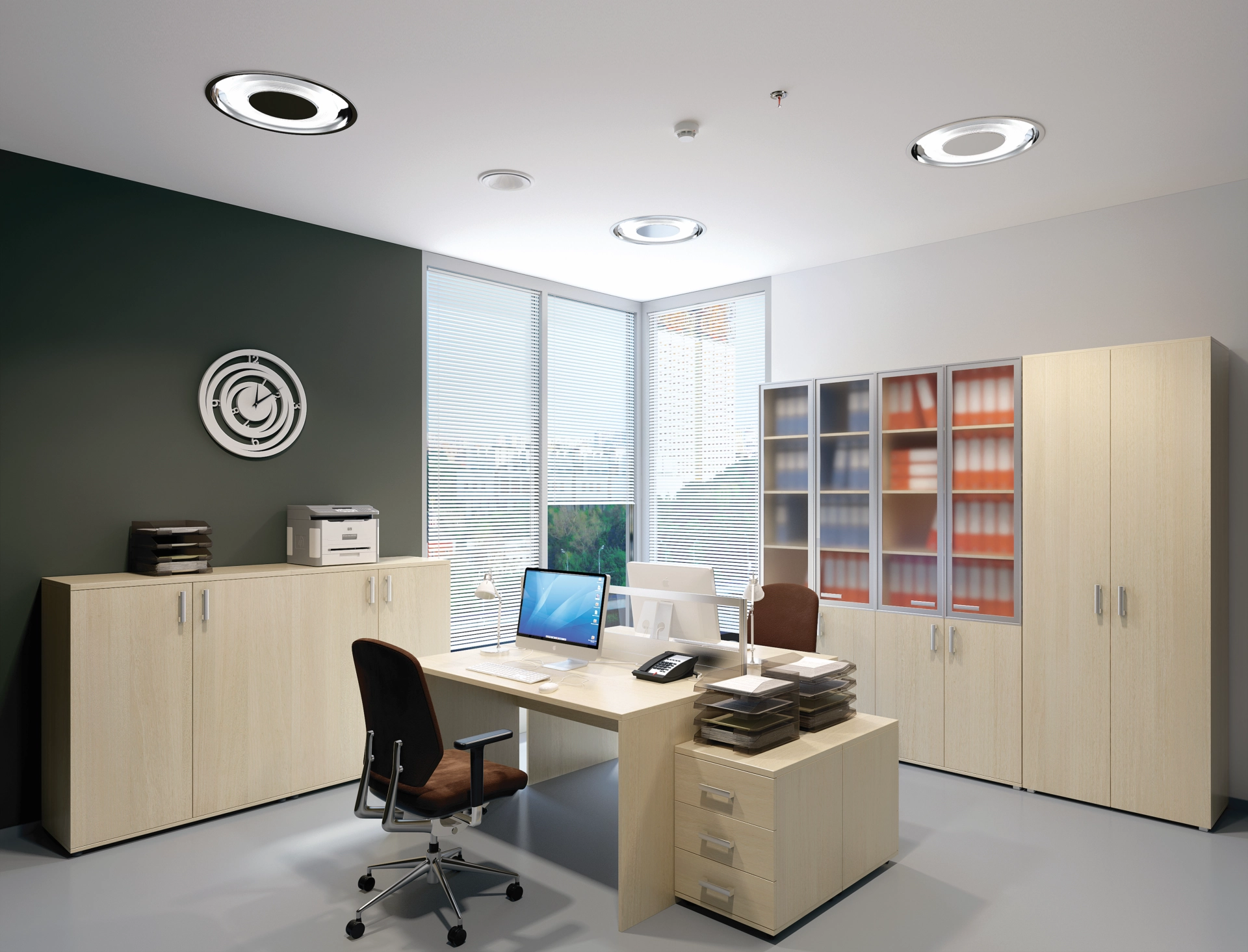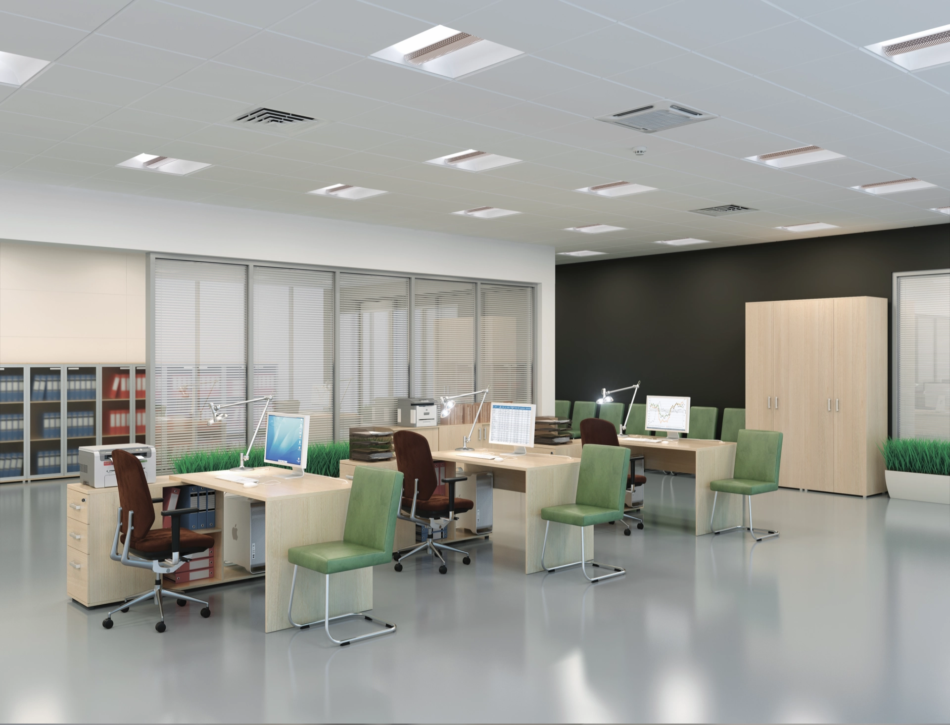 Столешницы, опоры столов, приставка, топы шкафов изготовлены из ЛДСП. В столах и рабочих станциях предусмотрены декоративные кабель-каналы.