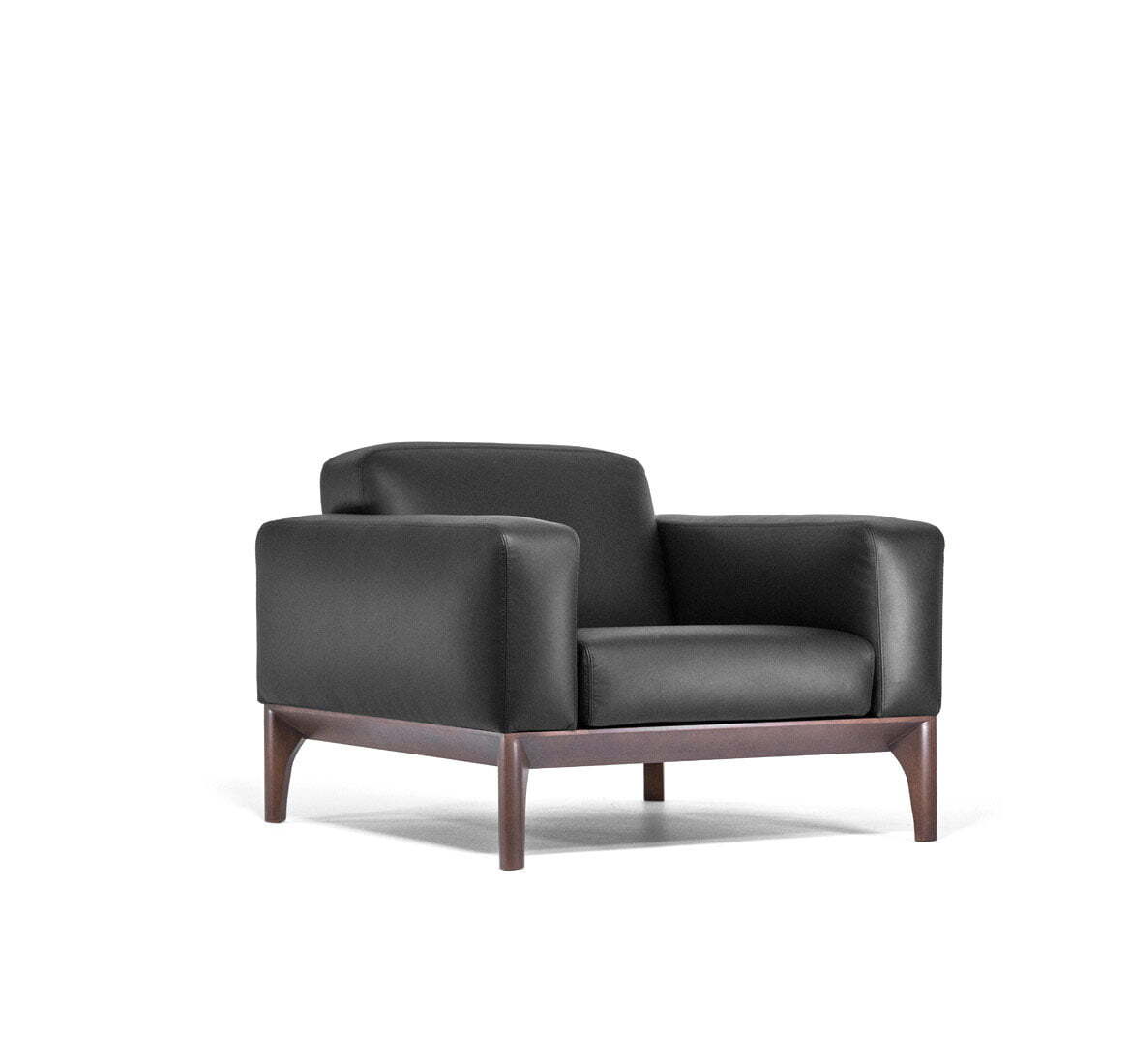 Ассортимент коллекции: двух- и трехместные диваны и кресло, выполненные в черной коже (задняя часть спинки – искусственная кожа) с деревянными опорами в гармоничном оттенке табака.